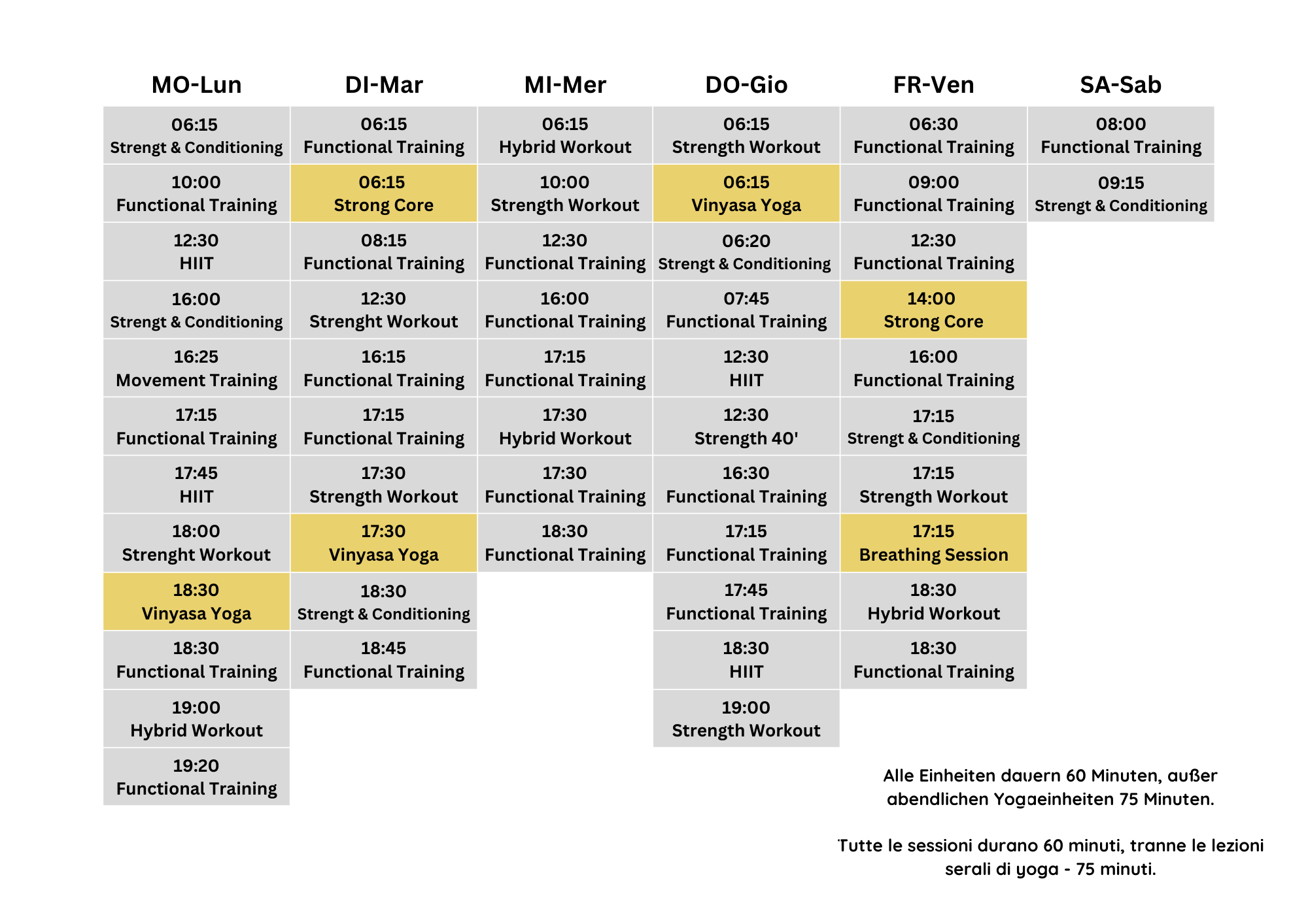 PS: Unten findest du unseren aktuellen Kursplan. Bitte schicke uns ein paar dir passende Trainingszeiten, sodass wir dein erstes Training einfacher fixieren können. Wähle für dein Probetraining ein Functional Training, Strength & Conditioning oder ein Strength Workout aus. Wir werden uns bei dir melden um deine gewählte Uhrzeit noch bestätigen.